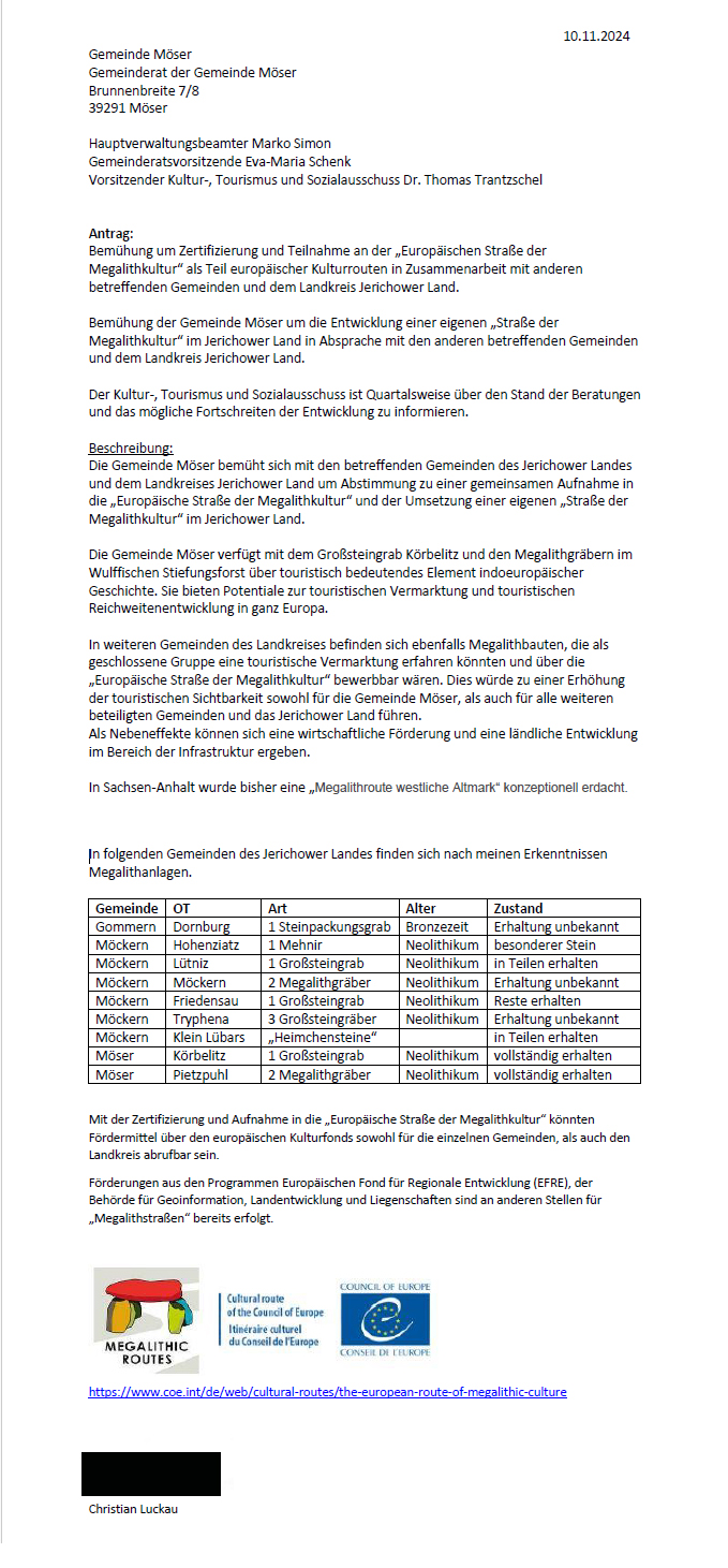 Mit einem Antrag zur Errichtung einer „Straße der Megalithkultur“ hatte der BfB Möser Gespräche der Gemeinde Möser mit anderen Gemeinden des Landkreises und dem Landkreis selbst gefordert, in denen Bauwerke aus dem Neolithikum vorhanden sind. Der Antrag wurde nach kurzer Erläuterung in die betreffenden Ortschaften Pietzpuhl und Körbelitz verwiesen.