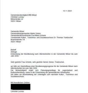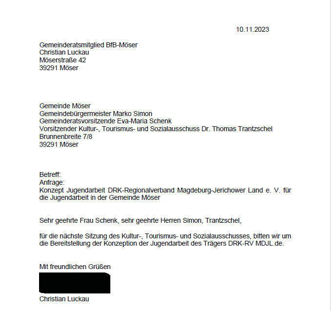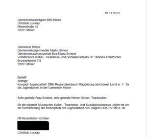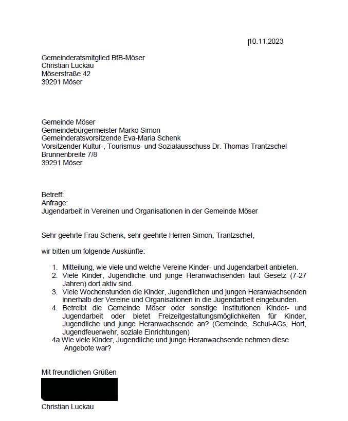 Der Zeitpunkt dieses Gespräches mutet dabei zumindest seltsam an. Hatte die Fraktion BfB-Möser doch in der letzten KTS erhebliche Zweifel an der derzeitigen Jugendarbeit gehegt und dies mit Zahlen und Studien belegt. Der Ausschuss war dabei soweit übereingekommen, dass jeder Jugendclubs einzeln zu bewerten wäre. Vor der neuerlichen KTS hatte BfB-Mitglied Christian Luckau drei Anfragen zu Bevölkerungsprognosen, Jugendaltersstatistiken und Jugendarbeit in den Vereinen gestellt. „Dies muss bei den benannten Personen zu einer Reaktion geführt haben, die in das besagte inoffizielle und nicht öffentliche Treffen mündete“, so Luckau spekulierend.