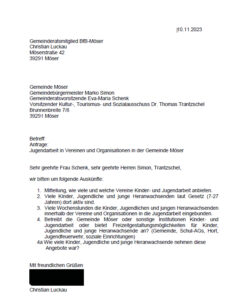 Noch in der letzten KTS hatten sich die Ausschussmitglieder darüber verständigt, Vertreter von Schulen, Vereinen und dem Träger der Jugendarbeit in der Gemeinde Möser einzuladen.